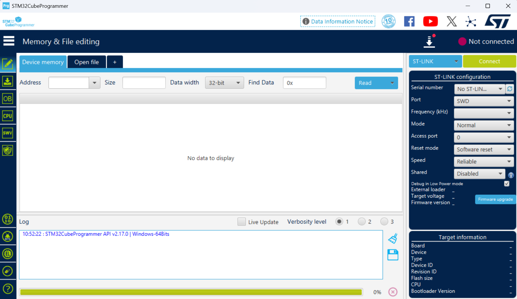 To program the MCU, we use the STM32CubeProgrammer. Connect the STLINK-V3 to the computer and the adapter board using the 10-pin ribbon cable. Press the Connect button to connect and identify the board. Program or flash the MCU by clicking on Program.