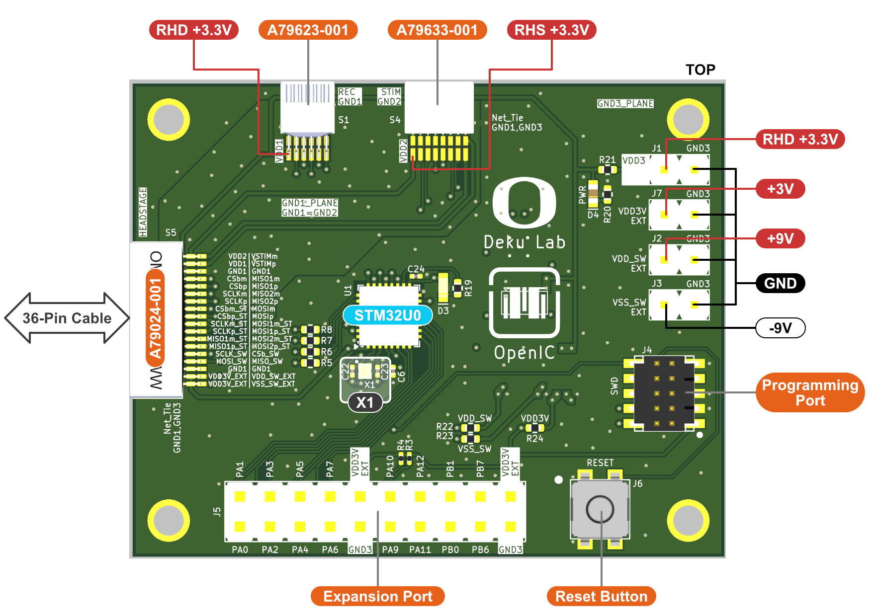 The current use of the MCU is to program the state of the switches in the headstage after the adapter board is powered on. You could further expand the functions of the MCU to adapt the Iris-128s neural interface to your project. For this purpose, the adapter board features a reset button, a 32 kHz crystal, and a expansion port with flexible GPIO for easy prototyping and development.