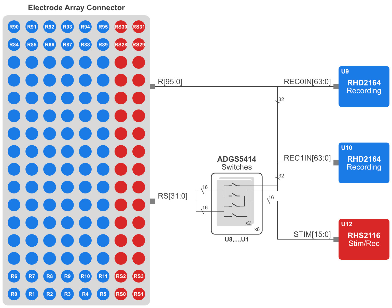 The figure below shows the mapping between the Electrode Array Connector, RHD2164 recording chips, and RHS2116 stim/record chip.